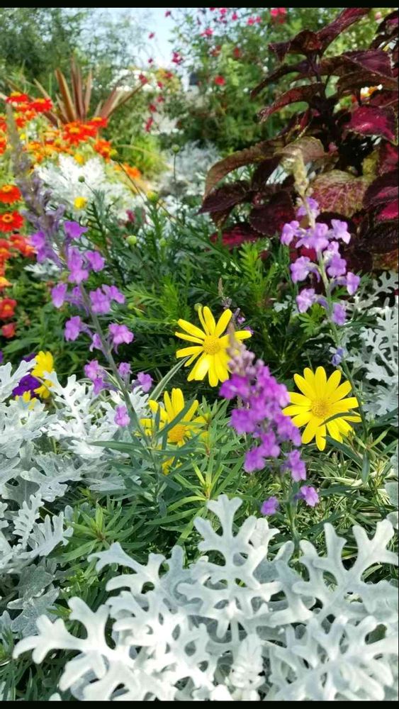 シロタエギク🌿の明るい色から、奥に行くに連れ、暗い色が入って来る遠近感のある構成お見事です😍