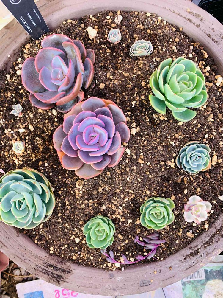 七福神丼には、ほど遠いけど大きな鉢に七福神とダスティローズの寄せ植えしてみたよ。