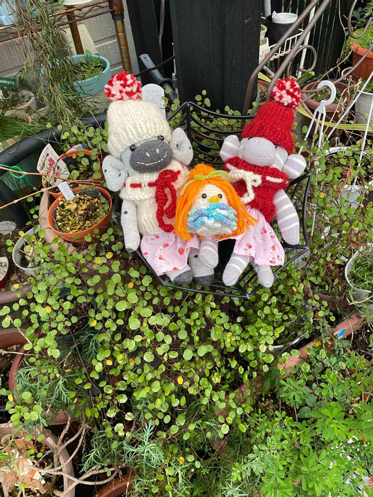 可愛いニットのアマビエ様とソクモン姉妹、ワイヤープランツの上で仲良くピクニック💖