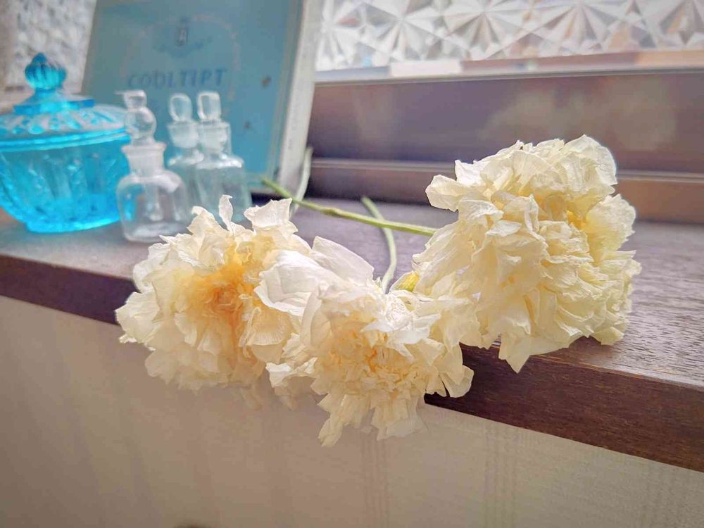 切り花で楽しんでおりましたが、手違いで花茎が折れてしまったので吊るしてみました。オフホワイトの優しい色味になりました🥰