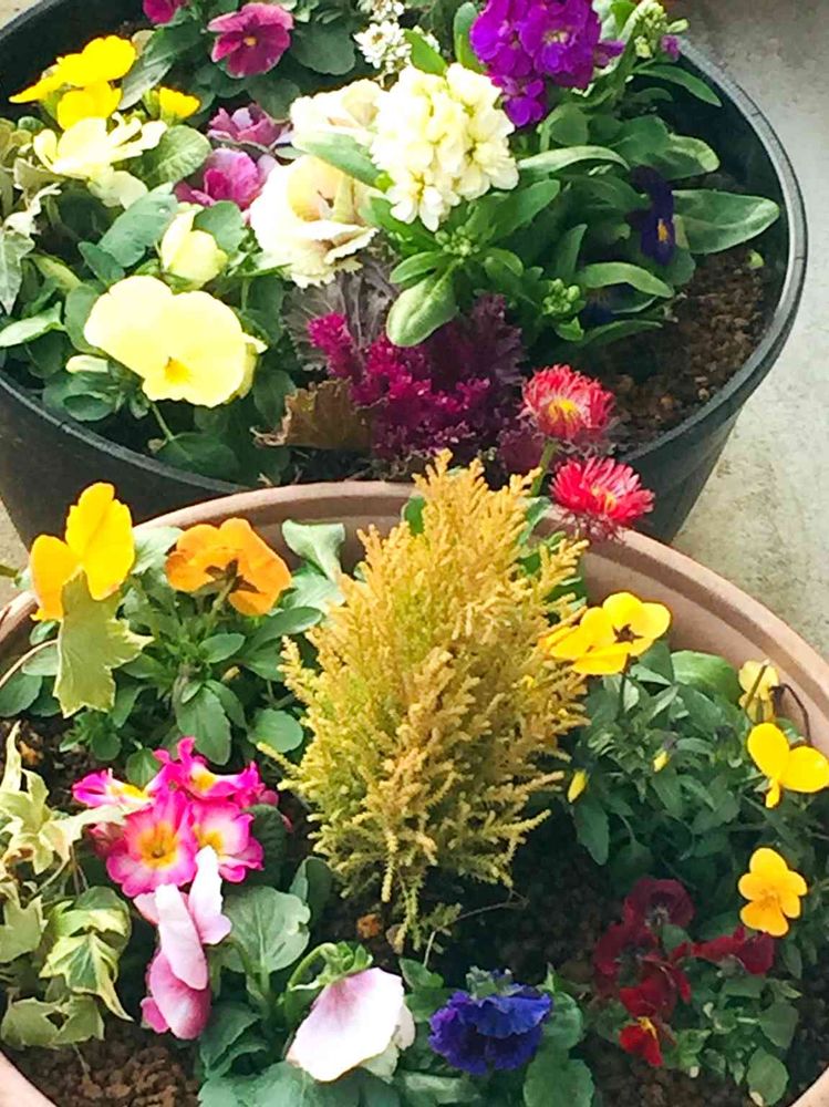 ゴールドクレストを中心に周りにビオラ・パンジー・デイジー・へデラなど植えてみました😊