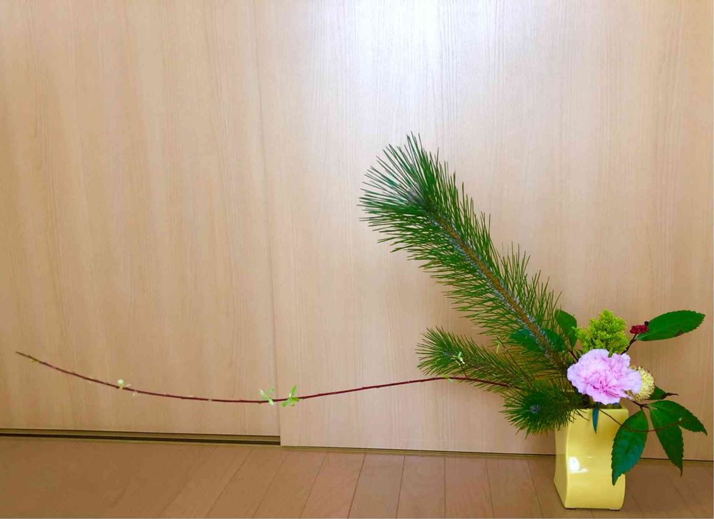 お正月のお花。松に珊瑚水木、千両、ピンポンマムが残っています。珊瑚水木は新芽が出てきて、長く楽しませてくれるお財布に嬉しい花材達。カーネションとソリダスターを追加して生け直しました。