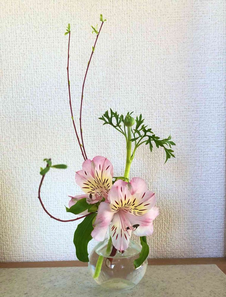 切り落としたアルストロメリアとラナンキュラスに珊瑚水木をそえて、小瓶に生けます。最後の一輪まで堪能🤗。