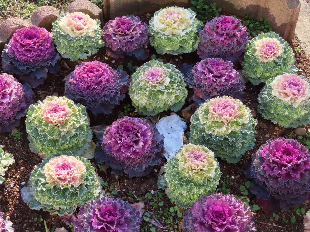 参拝に出掛けた先の道路沿いの花壇モリモリの葉牡丹でした。