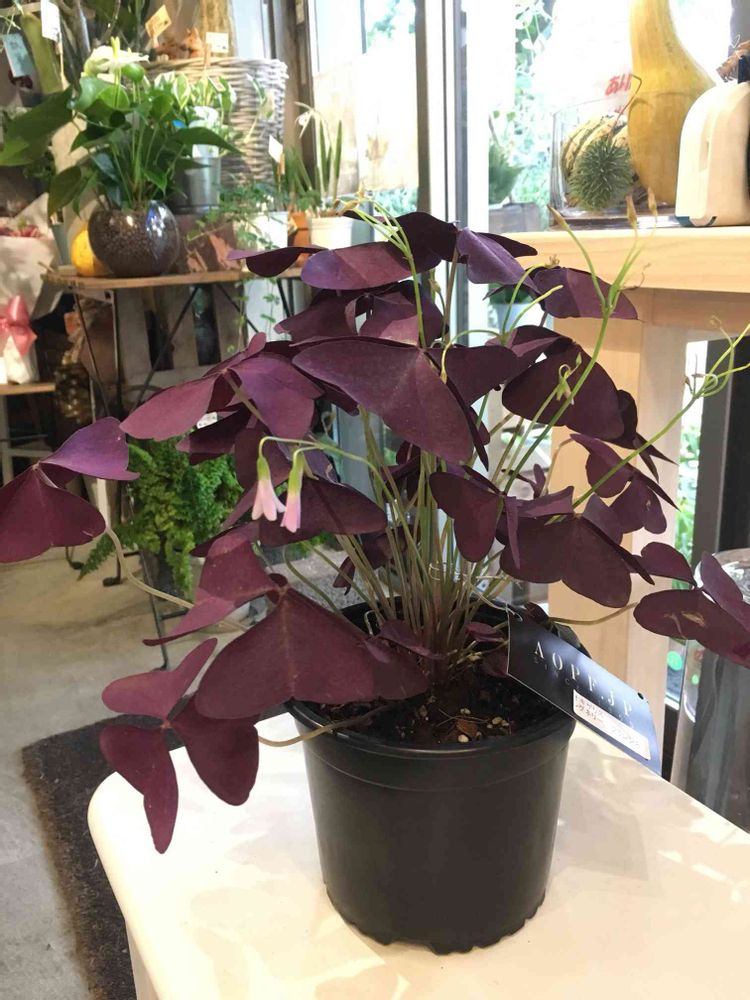 オキザリスレグネリー‘フランシス’。ボルドー色で、大きな大きな逆三角形のはが個性抜群です!