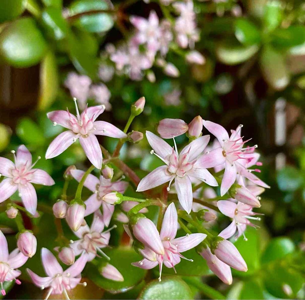 金のなる木の花がたくさん咲いてきました😊小さくて可愛らしい、ピンクのお花です✨