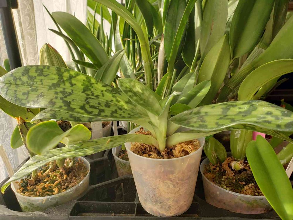 今年、優しいラン屋さんに、パフィオ栽培がかなり苦手な私に栽培チャレンジ用としていただいた、札に書いてある名前があまりに💨長すぎてよく分からない交配種のパフィオさんの栽培記録😳