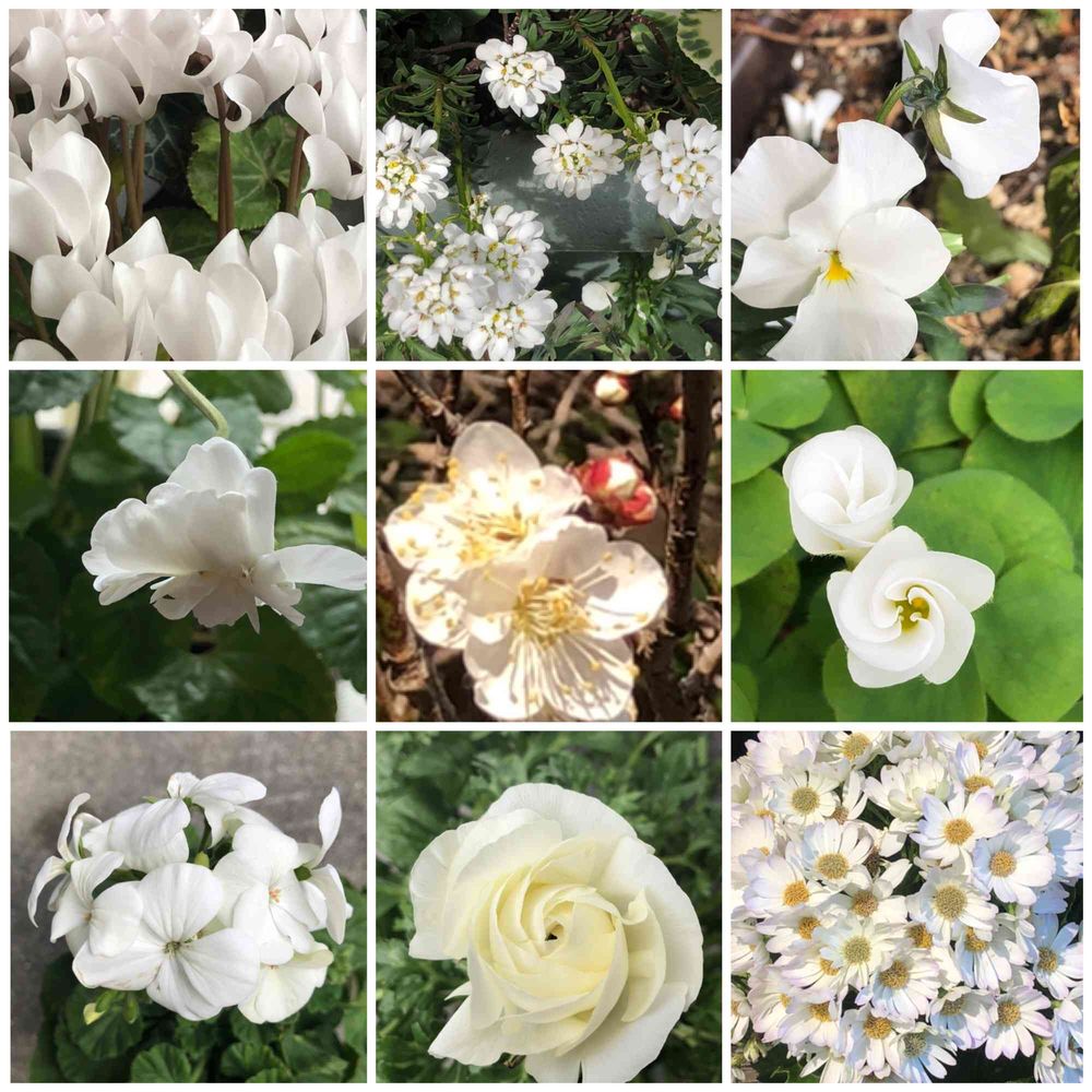 白いお花の集大成‼️白は清楚で素敵ですね🎵我が家の白はパンジーとサイネリアくらいです😃🍀😌🍀