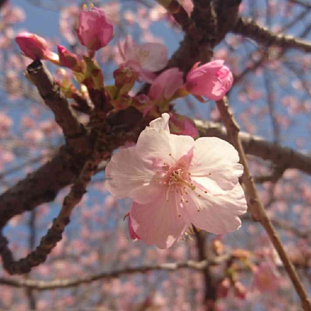 淡い紅色で、少し小振りで平開した花をつけてました。一番早咲きで知られる寒桜かな🤗
