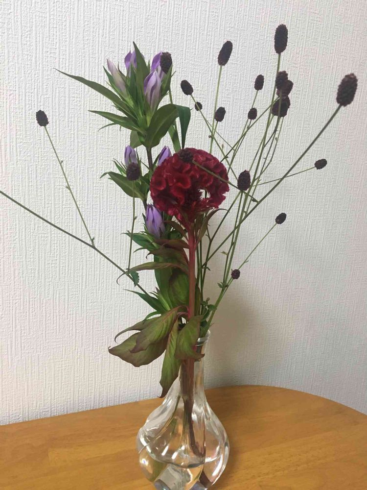 赤いのは鶏頭、ワレモコウ、リンドウ
