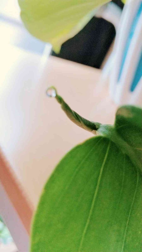 ポトスのトルネードしてる新しい葉っぱの先に、可愛らしい露が💕