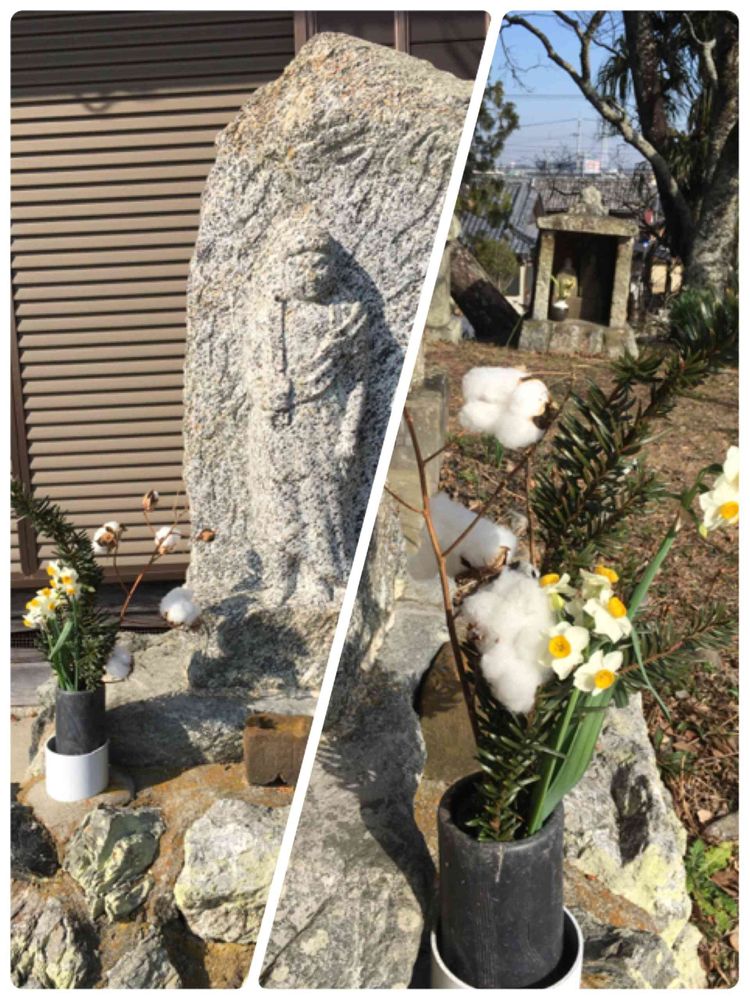 お地蔵様に綿の花が飾られていました✌️