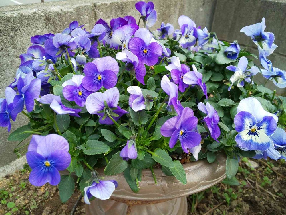 微妙に違う青色のパンジー寄せ植えが咲きそろってきました。