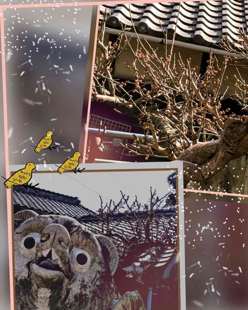 瓦屋根と梅の木の前にある大きな狸の置物がよくあっていました🦝