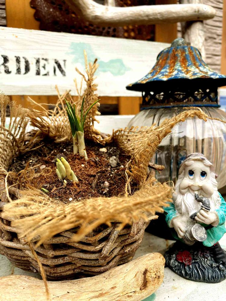蔓カゴに麻布敷いて・・・。奥のランプや、流木も💗💘