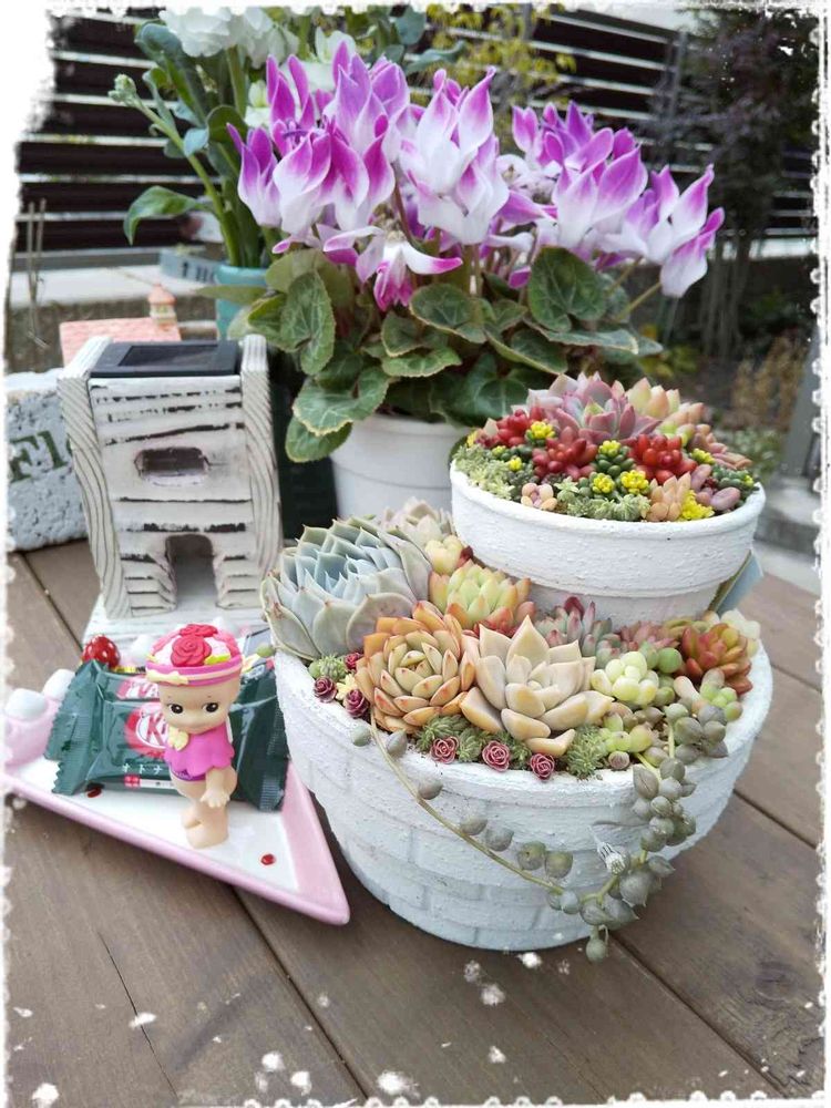 豪華なシクラメンをバックに豪華な多肉ちゃん2段寄せ植え 最高に素敵💖