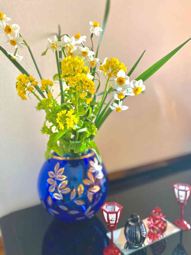 先日の雛飾りのお花の花器を変えて、サイドボードに。🎎は、鹿児島で一目惚れして購入した薩摩切子の🎎。