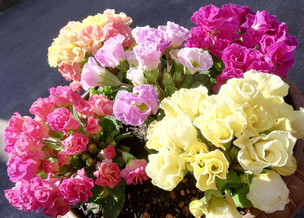 先日、急ぎ用事の中💨花屋さんの前に並んだポット植えのプリムラ。