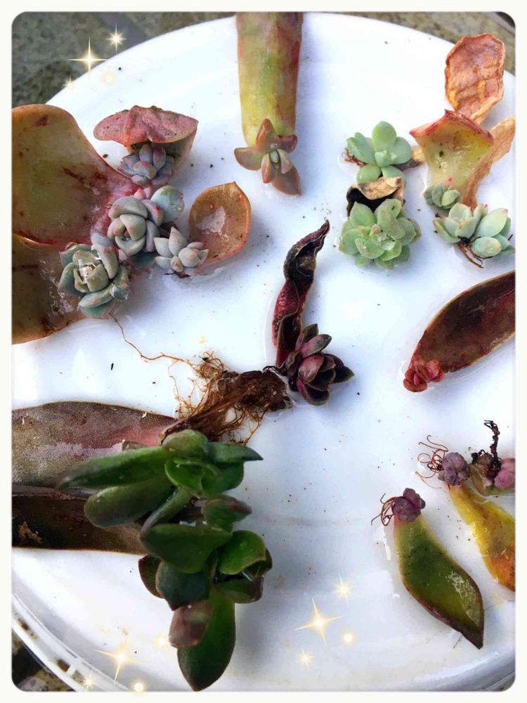 葉挿し入れてるトレー 枯れ葉やホコリで汚かったから😅 お皿に並べてみたょ🎶