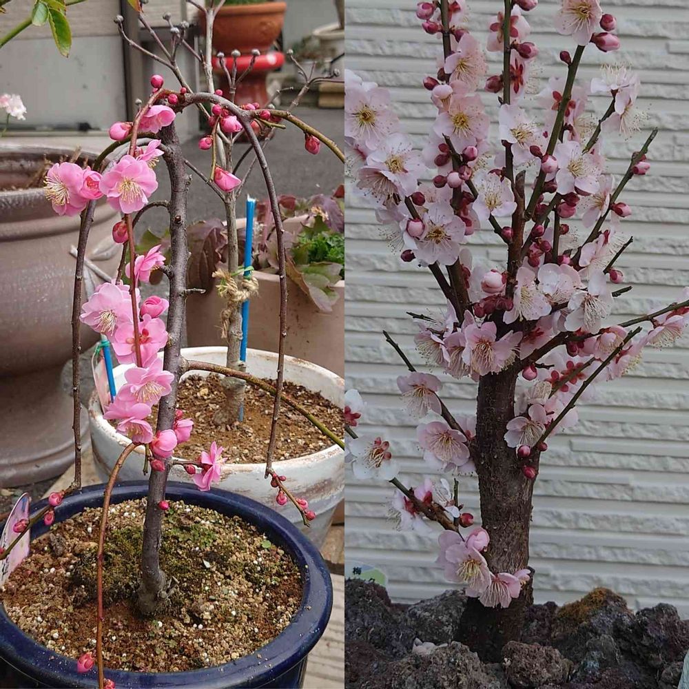 さてじいちゃんの今日のpic⤴️🆙は🌸枝垂れ梅と🌸盆栽梅のダブルpicです💮💕枝垂れ梅はまだ満開ではないけど待ちきれず投稿でそうろう🧙🙇🦸🐒