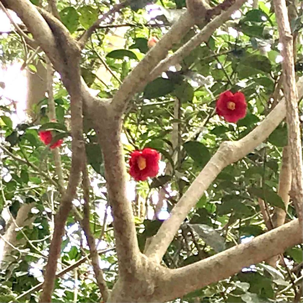 空中に浮いてるようなツバキの赤🌺