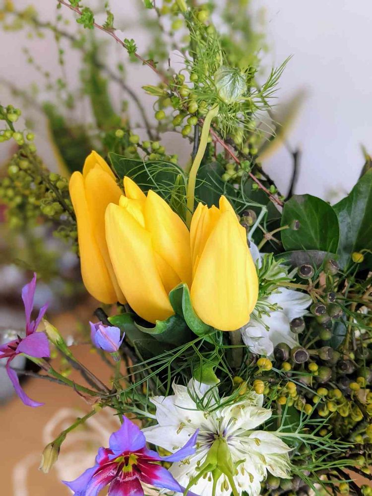 生花のアレンジ💐チューリップ🌷の花びら💛が少し開きました(*ˊᗜˋ*)