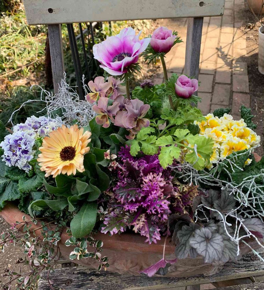 好きな花を選んだら黄色、紫、ピンク、オレンジ。これだと寄せ植えはまとまらないな‥と思ってましたが、手持ちのビオラと葉牡丹 光子ポラリス、ヒューケラがアネモネの色で、どうにかまとめることができました。