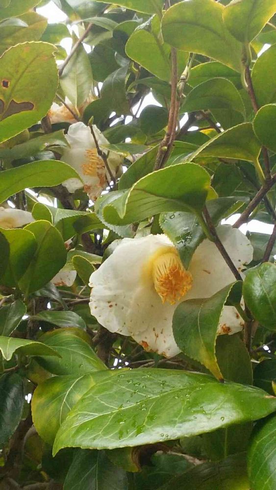 先月から咲き出した白の玉之浦(椿)、ぼてりと花を落としながらよく咲いている