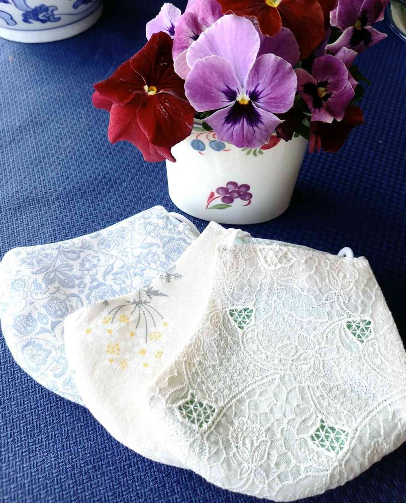 おしゃれなマスクですね〜💕❣️ミモザ模様にレースに…、春ですね、見ているだけでウキウキしますね😊🎵💐。
