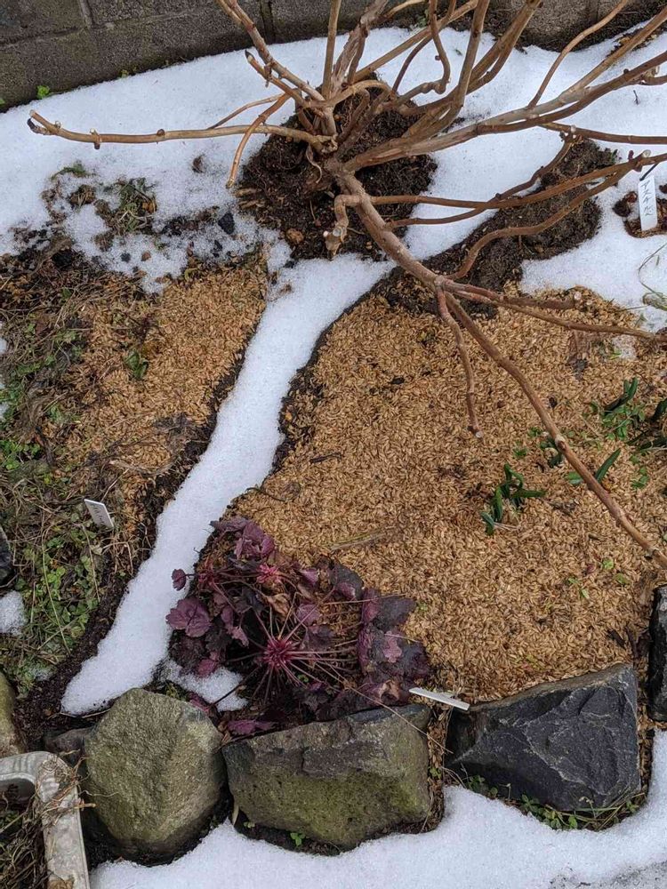 でも、紫陽花の根本からの雪のトンネル跡は…🤔ネズミかモグラか?被害がなければいいのだけど😓