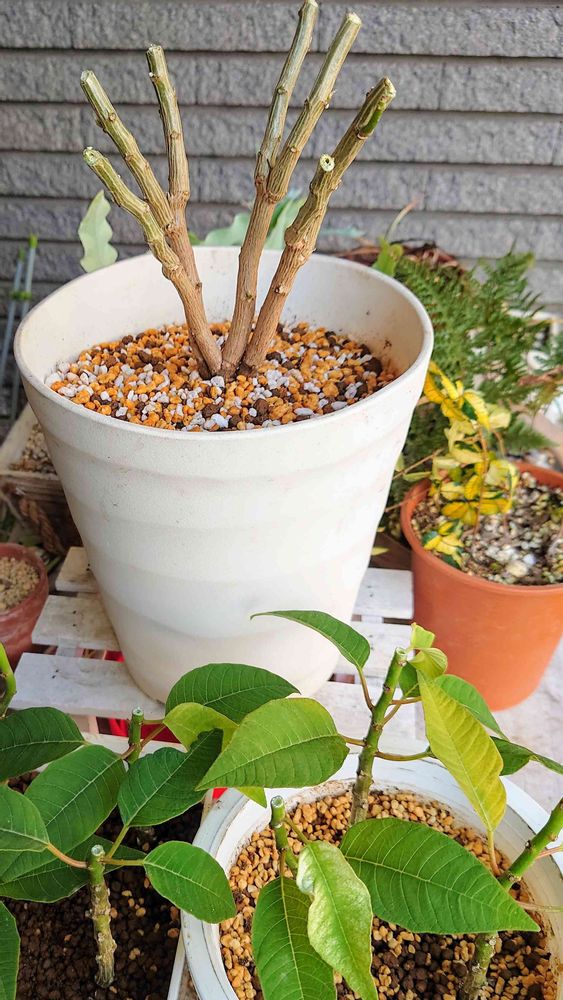 元箱入り娘「プリンセチア」は3年目になり 枝を剪定して 丸坊主になりました😅 これから新芽が出て伸びたら 整えていきたいと思います❗☺️