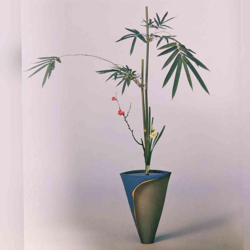 この作は、真とあしらいに、切り口をきっぱりと表して立て、陽方へなびく枝に、爽やかな竹の趣を表しています。