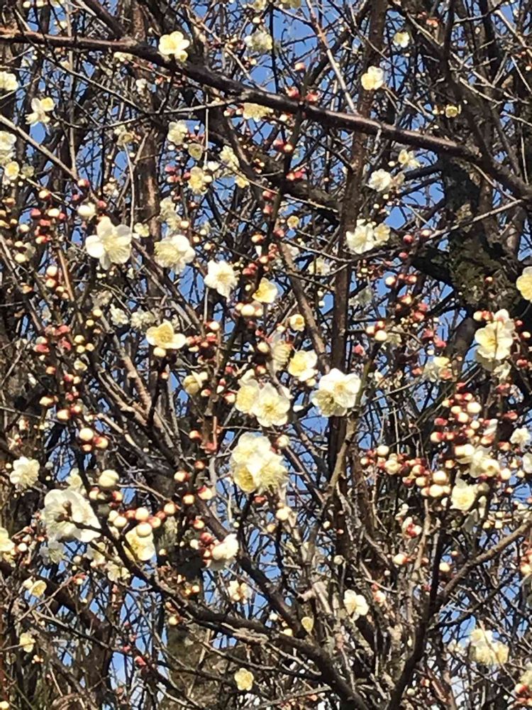 何事もなかったように青空に梅が勢いよく咲いていました。
