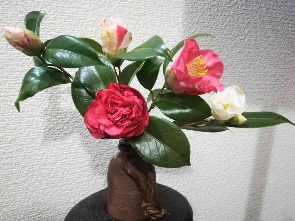 白侘助、白地に赤の絞り柄、紅色の八重(?)←名前が分からず機能🔍で出たのが薔薇🌹と椿でした🤭