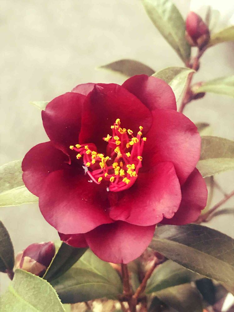 ベランダの椿、第一号が咲きました!