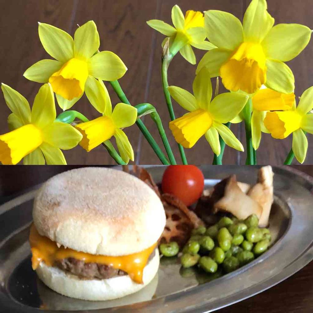 日課の散歩から帰ったら娘手作りのランチとさわやかな水仙が待っていた❣️😋嬉しいねー😃