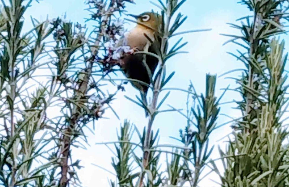 ローズマリーの花をつつくとりさん。とりには詳しくないのですがメジロでしょうか?