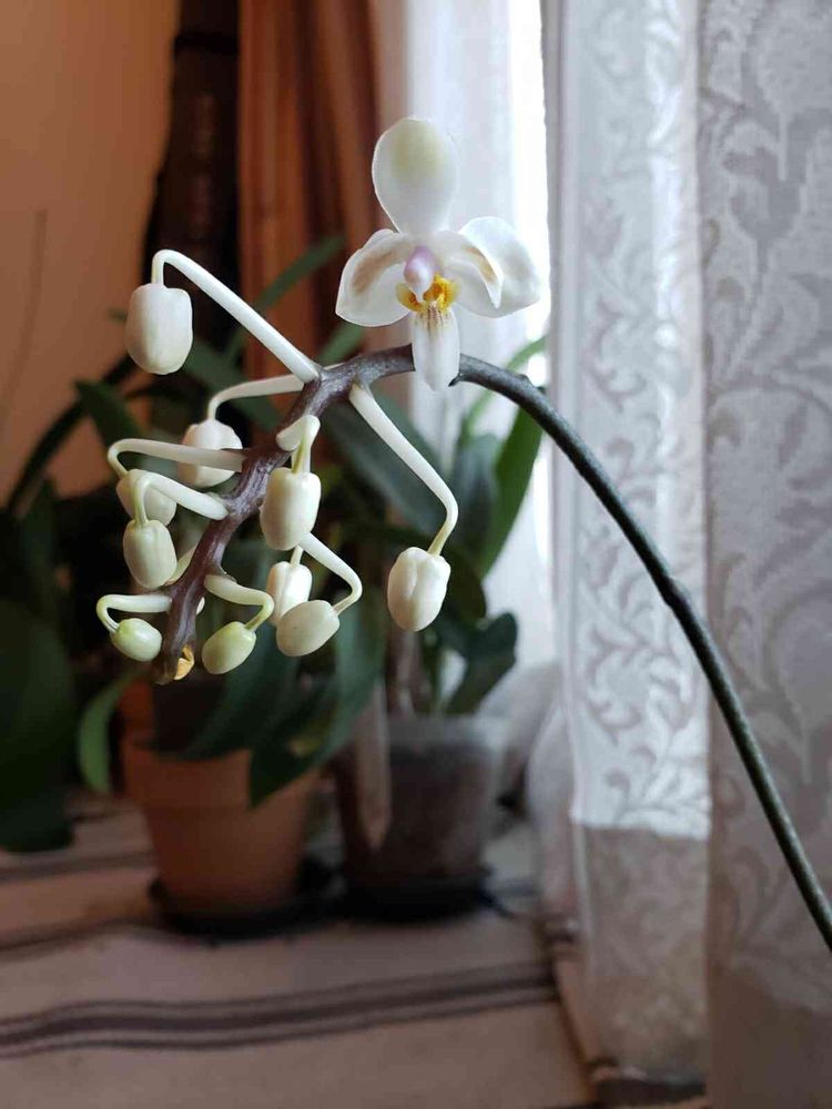 可憐な花。蕾の付き方が他の胡蝶蘭と少し変わっていて何だかオブジェみたい😆🌿