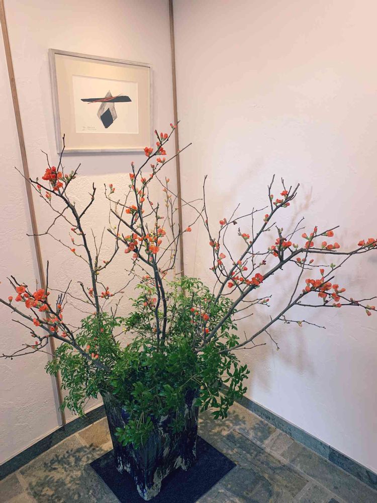 エントランスの生け込みはボケの花とアセボ。