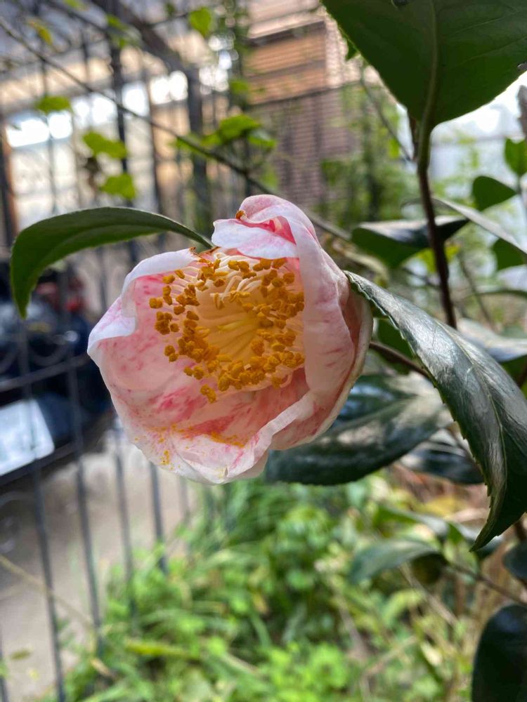 白〜淡桃地紅吹掛け絞一重玉状咲中輪 花期:11月〜4月