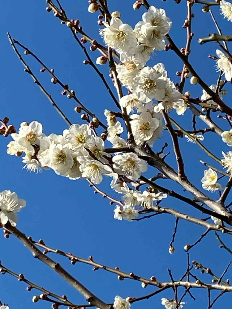 青い空に白い梅のお花映えますね🎵梅の実はそのままですか😉