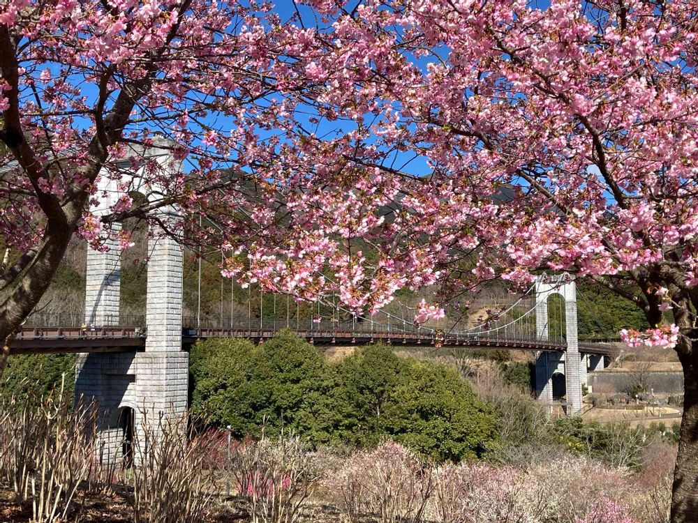 今日の戸川公園の河津桜と風の吊り橋🌸今が見頃です🌸