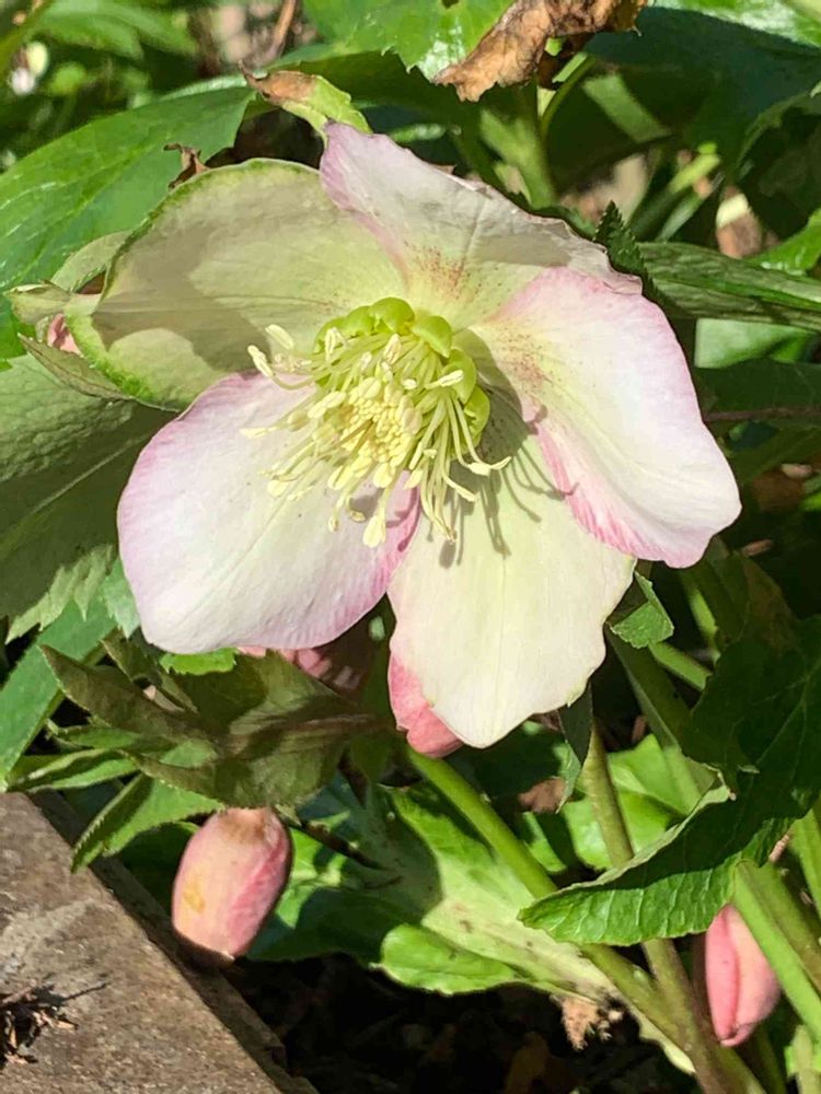 ボーダー花壇で最初に咲いたクリスマスローズです🌿朝日に向かって、花芯のおしべがくるんとまつ毛みたいでかわいい💕