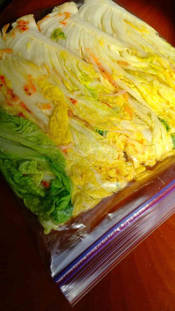 今日、千切り🥕・水菜・裂いたさきいか・細切り昆布・鰹節・少量の塩・粉末顆粒だしと一口大の白菜を保存袋内でざっくり混ぜました。