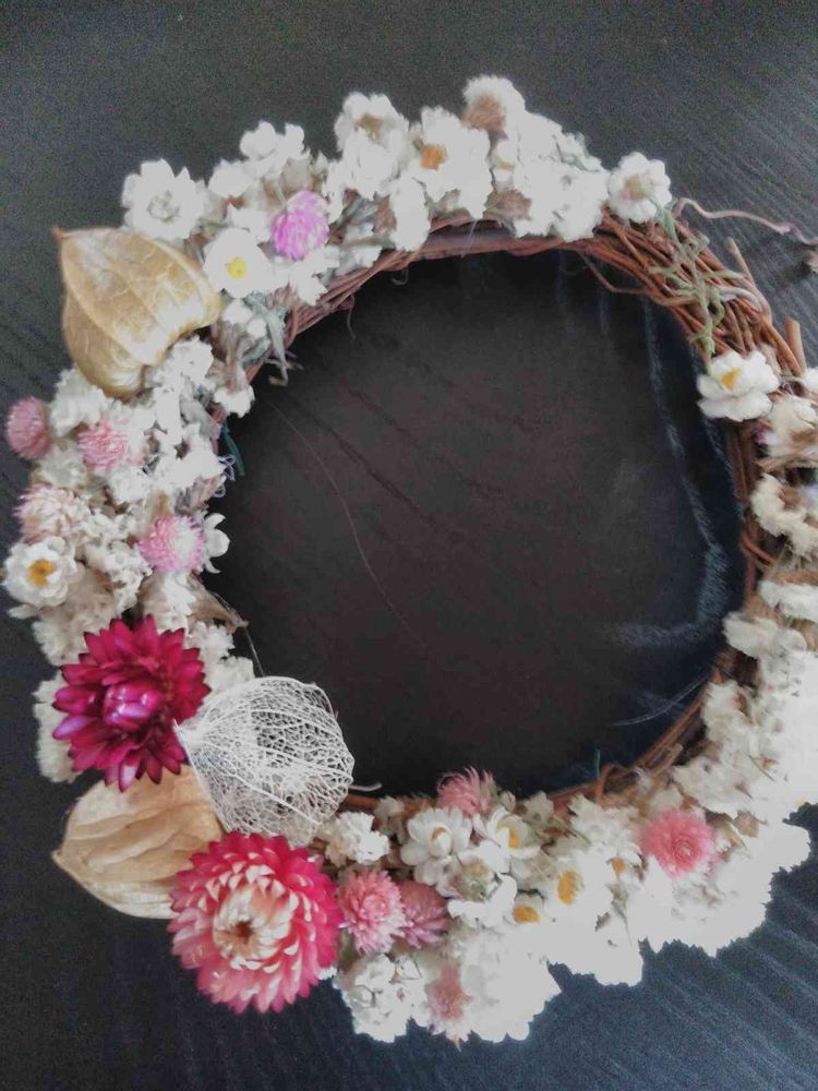沢山咲いた花かんざしを、スターチスのリースに加えて