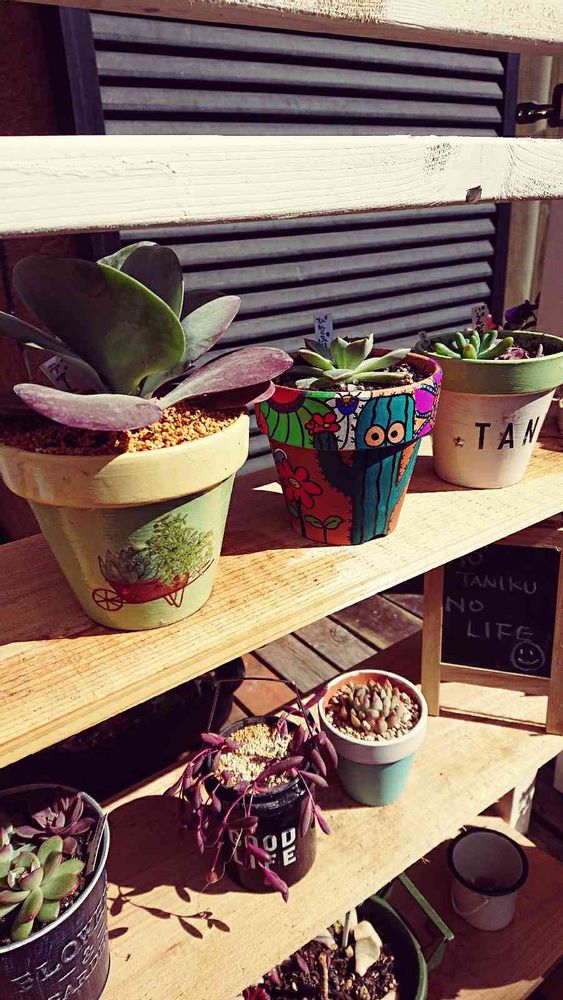 お早うございます✨いくつか、持っていなかった多肉さん達をお迎えしリメイク鉢に植えてみました😆可愛い絵を描いてくれたのは娘です👍ちょっと楽しくなってきた🌵