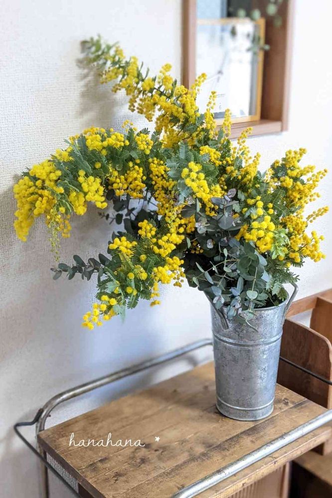 わあ、ミモザ大好きです〜。hanahanaさんにかかると、ブリキにインしただけでこんなにおしゃれで華やかになるんですね。素敵です✨いつもミモザが植えられるくらいのお庭があればな〜と思いますが💛切り花もいいですね。リース作りも楽しそうですね。是非見せてくださいね♪