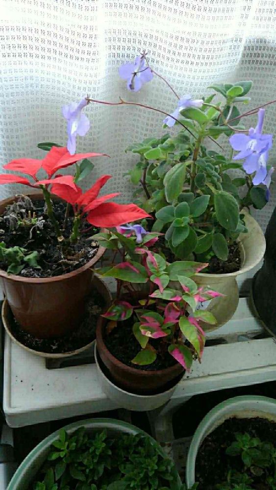 クリスマスのポインセチア、四季咲のストレートカーパスサクソルム、葉の色が楽しめるイレシネ 各々が色とりどりに避寒先で