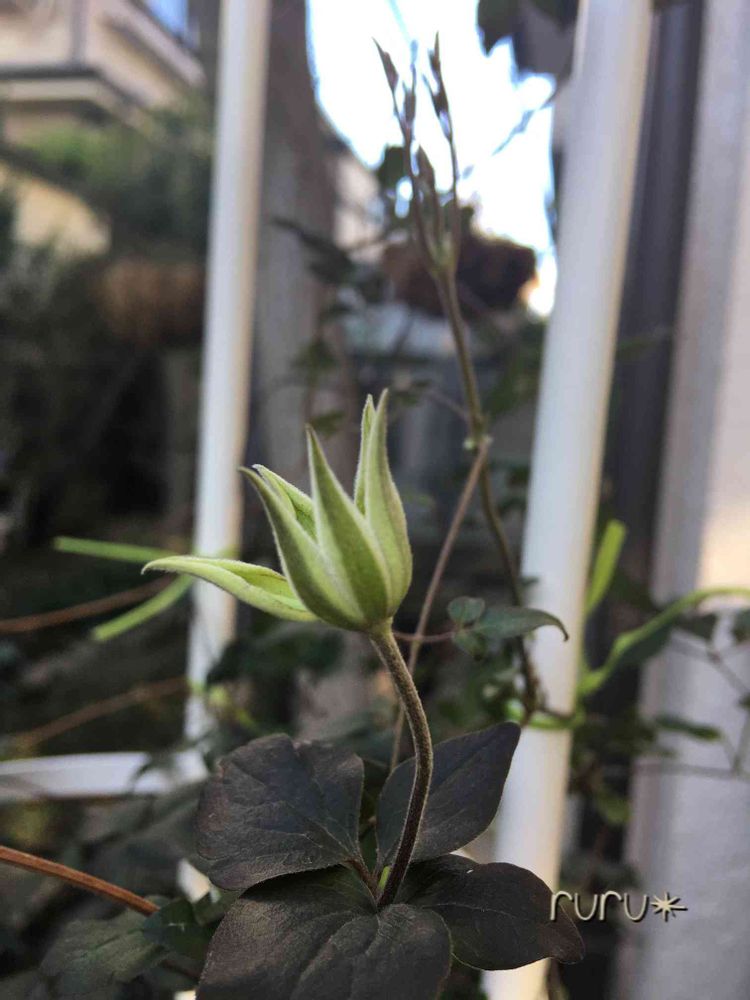 お庭のクレマチスちゃん(白万重orテッセン)蕾を見つけてからどのくらいたったかしら?なかなか進まなーい