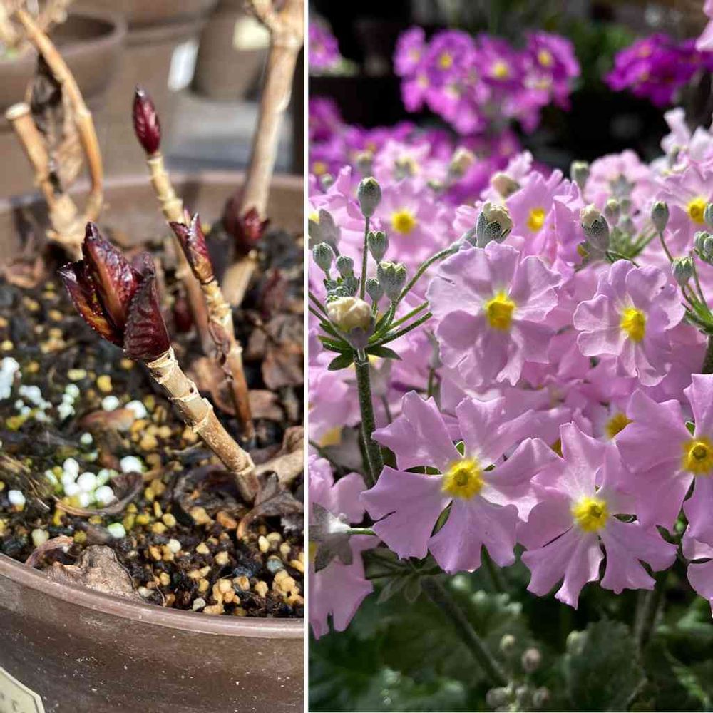 picは紫陽花【クイーンズブラック】の新芽とサクラ草です。